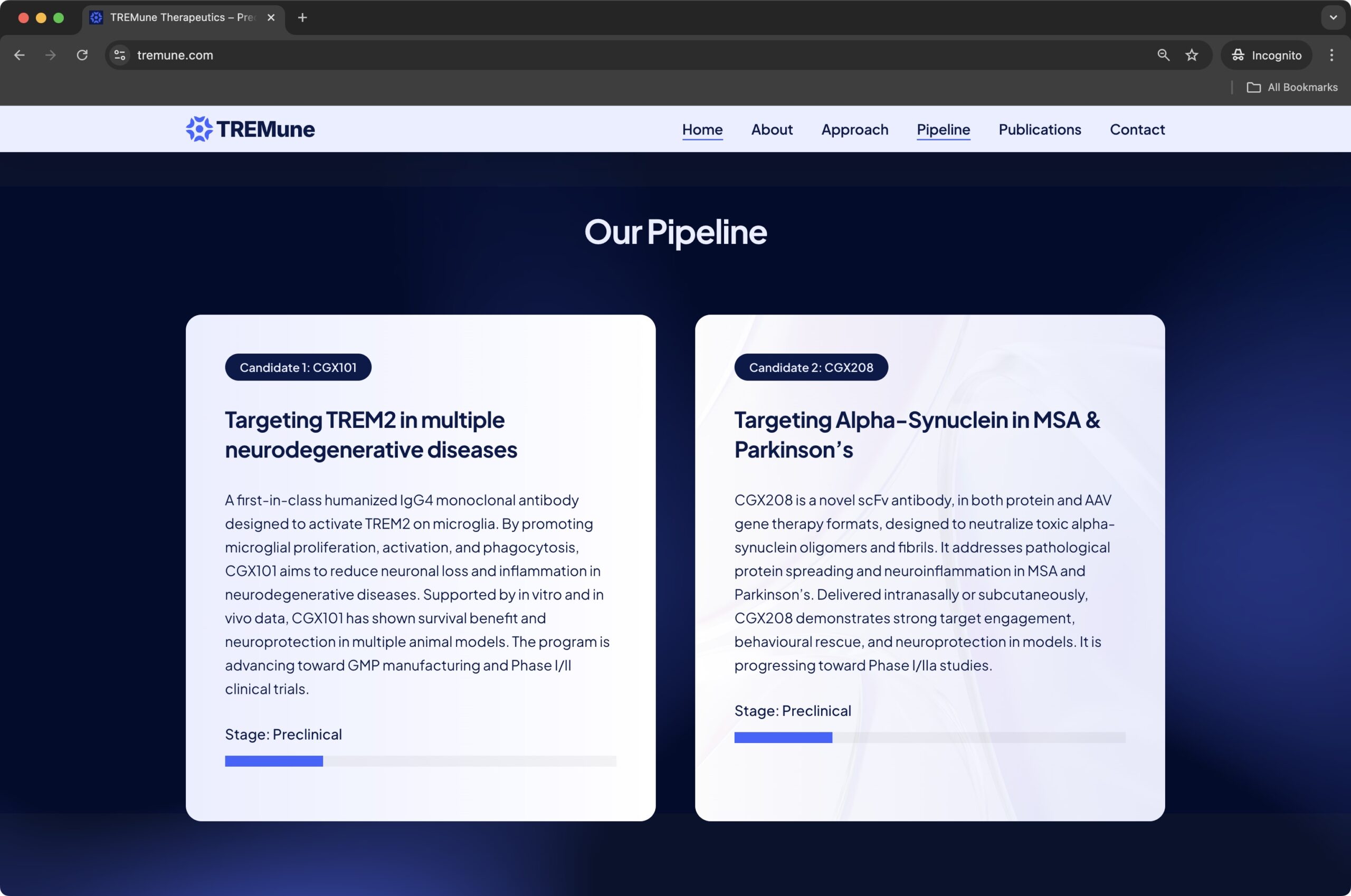 The result is a confident, professional site that gives TREMune a platform to introduce themselves to stakeholders and grow their brand. The one-page format keeps the focus sharp, while the bespoke branding sets them apart in a crowded biotech landscape.